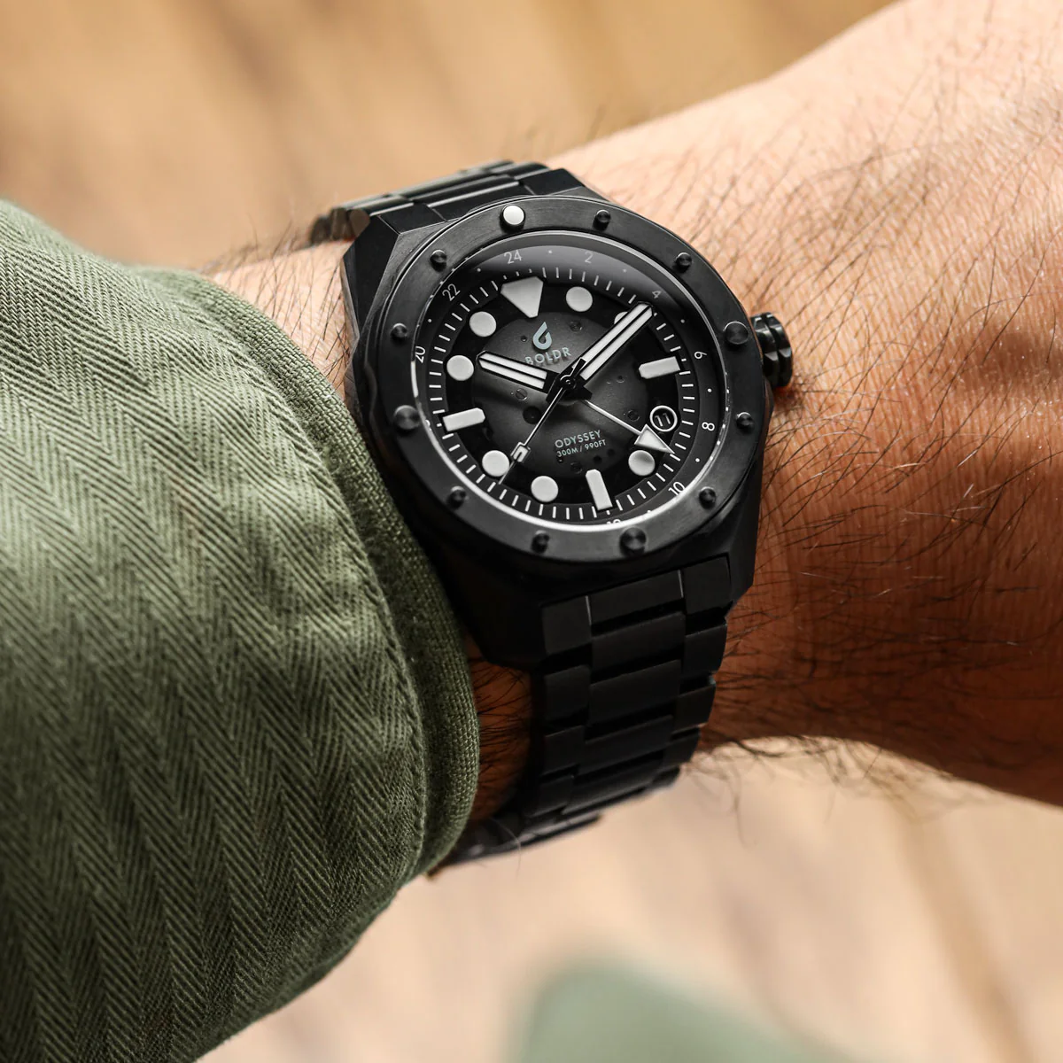 Built for those who navigate life with intention, the Odyssey Orca is a true GMT dive watch forged in DLC-coated titanium and powered by the Miyota 9075 — a mechanical movement that allows seamless local time adjustment without stopping the watch. Whether you’re crossing time zones or diving deep, it keeps pace without compromise.