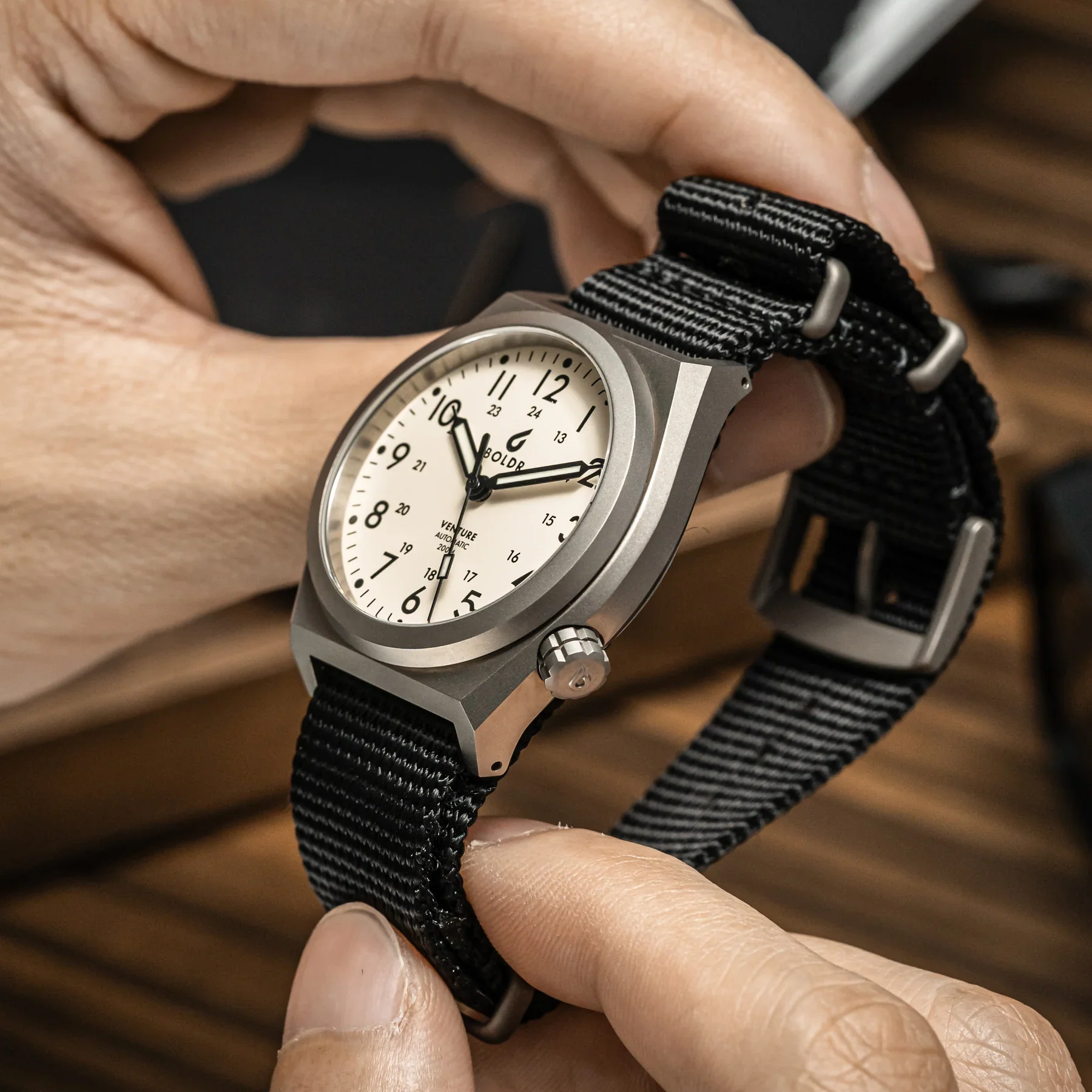 - The sleek, angular case is unique to Boldr and sets the Venture apart from other field watches.