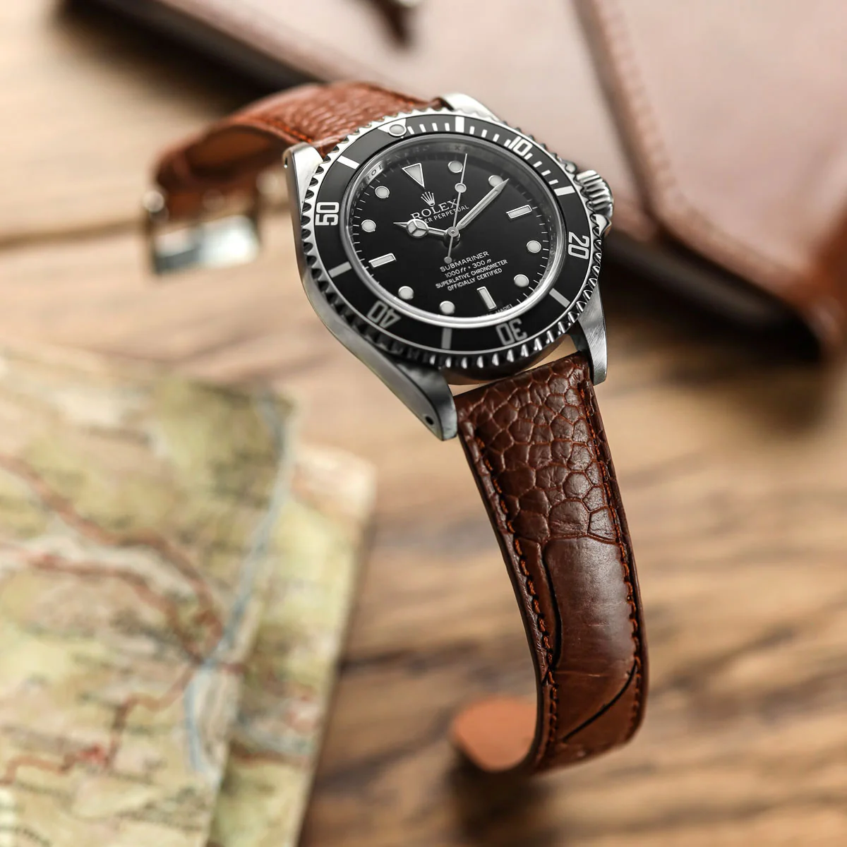 Ostrich leg leather is renowned for its exceptional durability, flexibility, and supple texture. Naturally enriched with oils, this leather is highly resistant to high temperatures and prolonged sun exposure, maintaining its quality and appearance over time. While crafting straps from ostrich leg leather can be more intricate and costly compared to calf leather, the unique qualities and luxurious feel make it a distinctive choice for those seeking something truly special in watch straps.